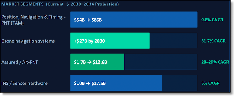 Another fast-growing segment is Assured and Alternative PNT software — the precise category Overwatch occupies — projected to reach $12.6 billion by 2034 at a 28% to 29% CAGR.