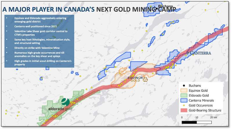 | Because while the world has been watching Equinox Gold bring the giant Valentine Mine into production, Canterra has quietly assembled control of 55 kilometers of that same Valentine Lake Shear Zone — the same geological engine that made Valentine Canada’s largest new gold mine.