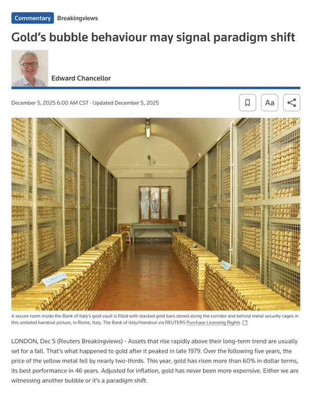 | Headlined “Gold’s bubble behavior may signal paradigm shift,” the op-ed by Edward Chancellor does a great job of explaining gold’s role as money throughout the millennia of human history, and recaps the drivers behind the bull markets in gold as an asset class since the early 1970s.