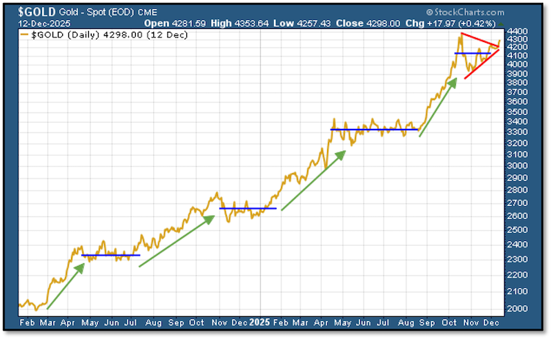 The latest example showed gold trading in an ever-tightening flag pattern that indicated a breakout was near. Here’s the latest version of that chart, updated through Friday’s close: